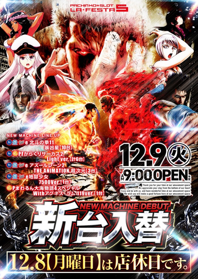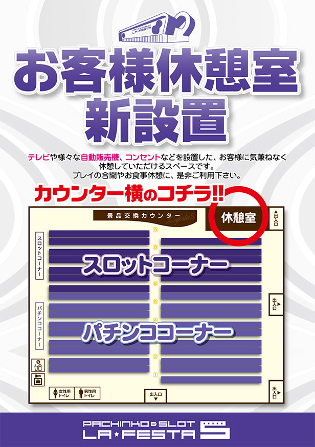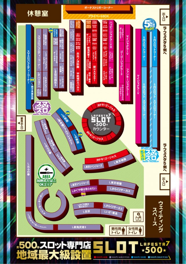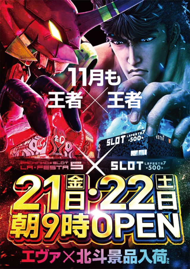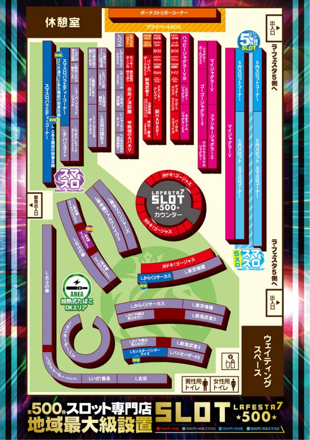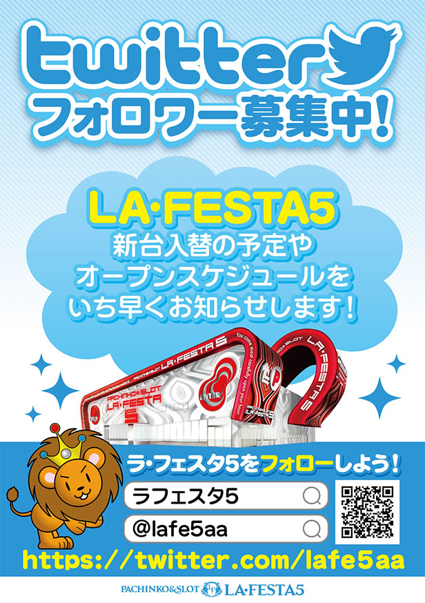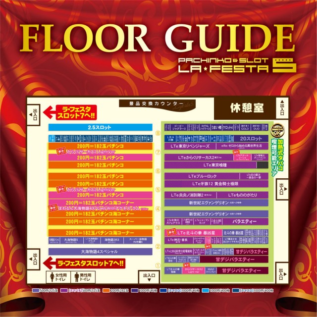 - ラ・フェスタ5 パチンコ: [500円/125玉] [200円/182玉] パチスロ: [1000円/46枚] [1000円/400枚] スロット7 パチスロ: [1000円/46枚][1000円/200枚]