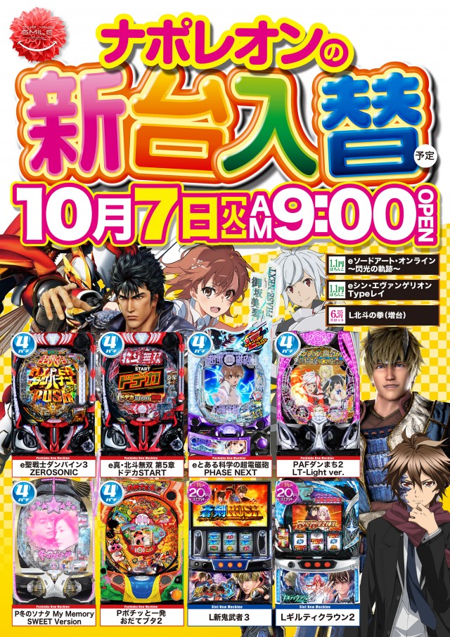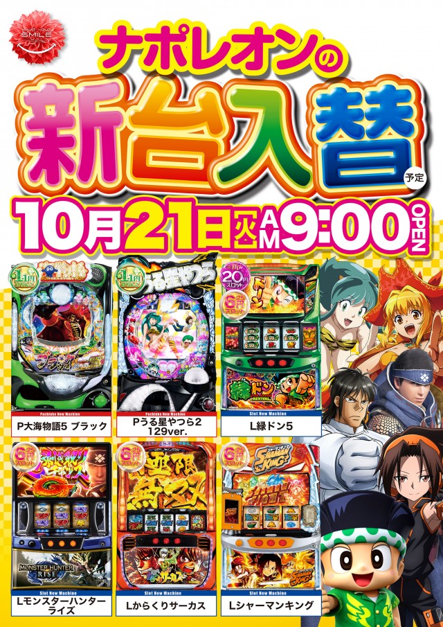 - より快適に♪より楽しく♪ 充実ラインナップの4パチ&20スロから 地域最大設置数の1.1円パチンコそしてトコトン遊べる6.25スロ!! でお楽しみ下さい!! 皆様のご来店をお待ち致しております。