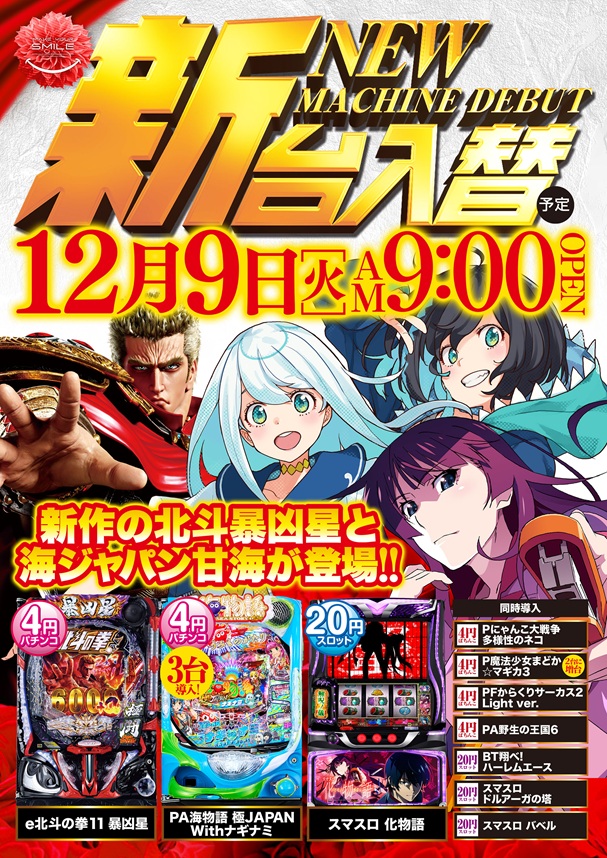 - [1000円/800玉]パチ:72台 [4]パチ:216台 [1000円/46枚]スロ:144台