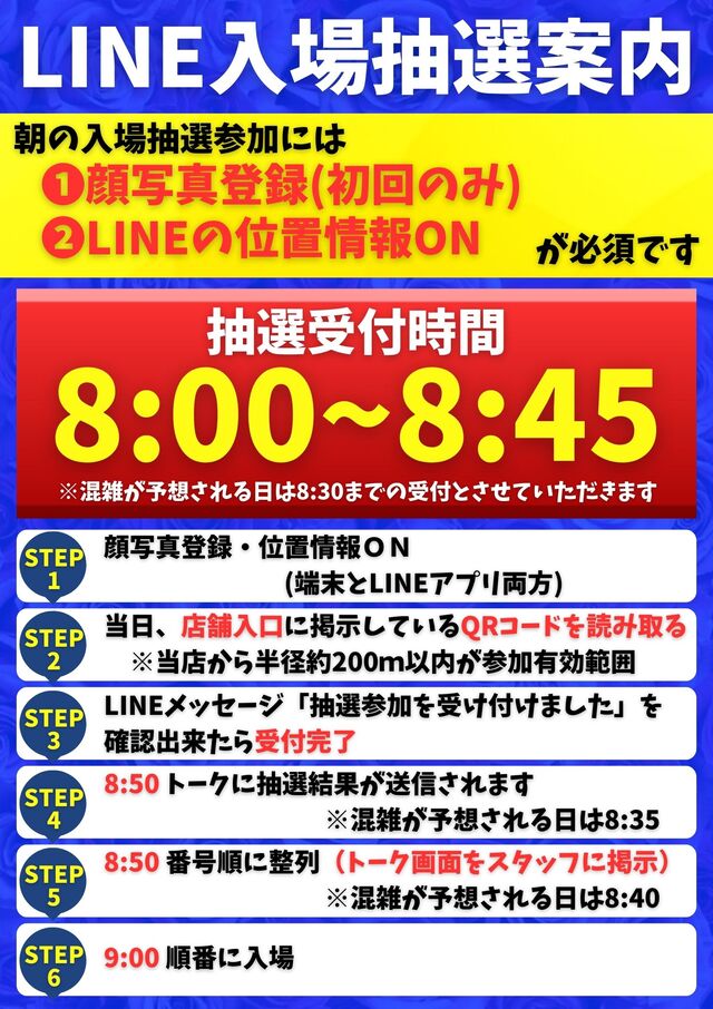 - LINEオンライン抽選 【抽選受付時間・場所】 日時:8:00~8:45、8:00~8:30 場所:店舗内 【ご準備のお願い】スマートフォンとLINEアプリの位置情報取得を常時許可してください。 【抽選参加方法】店舗に設置されたQRコードを読み込み受付
