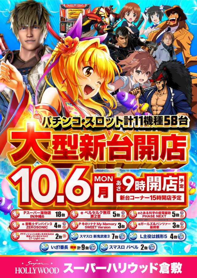 - スーパーハリウッド倉敷店, 4円パチンコ、1円パチンコ、スロットコーナー、5円スロットと4種類の遊技スタイルに加え、バラエティにとんだラインナップで様々なお客様の要望にお答えする自信があります! 「快適創造」をもとに従業員一同、多くのお客様に親しんで頂けるお店作りに日々取り組んでおります。ご来店を心よりお待ちしております。