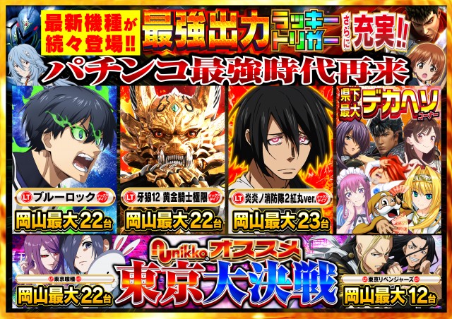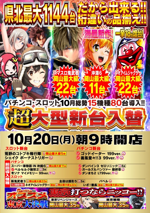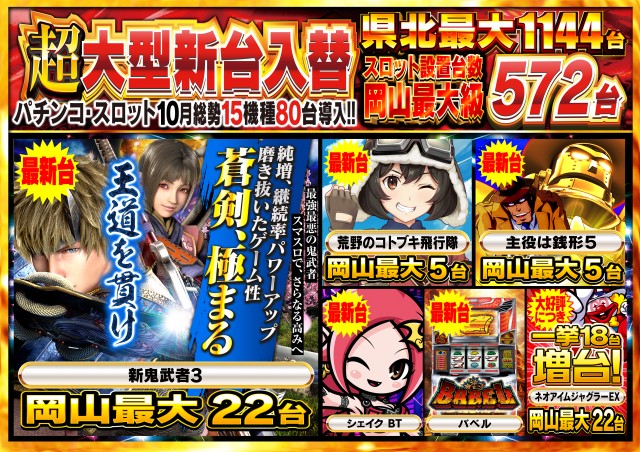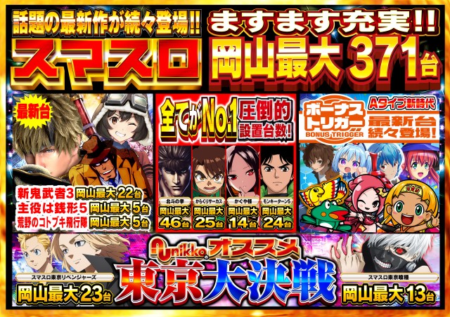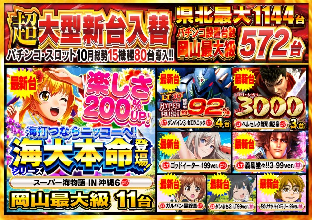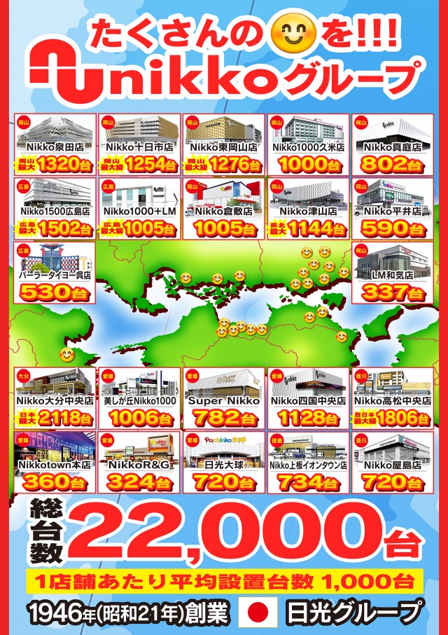 - ◆日本初防災特化型店舗 ◆岡山最大1144台 だから出来る 設置機種ラインナップ ◆広々とした楽々台間スペース ◆パチンコ・スロット 全台拡大計数機設置 ◆完全除菌・消臭ルーム ◆休憩ルーム コミック岡山最大数4000冊以上、 全席USBポート完備 ◆Wi₋fi完備 ◆VIP喫煙ルーム ◆マッサージコーナー ◆喫茶コーナー