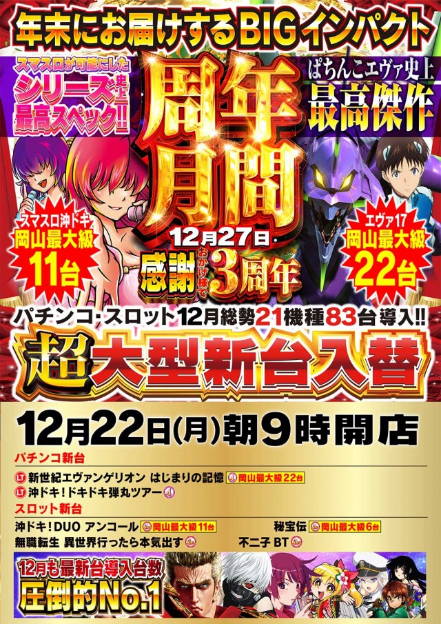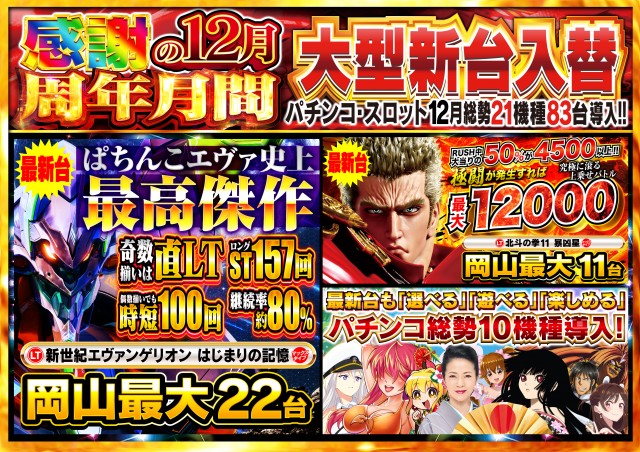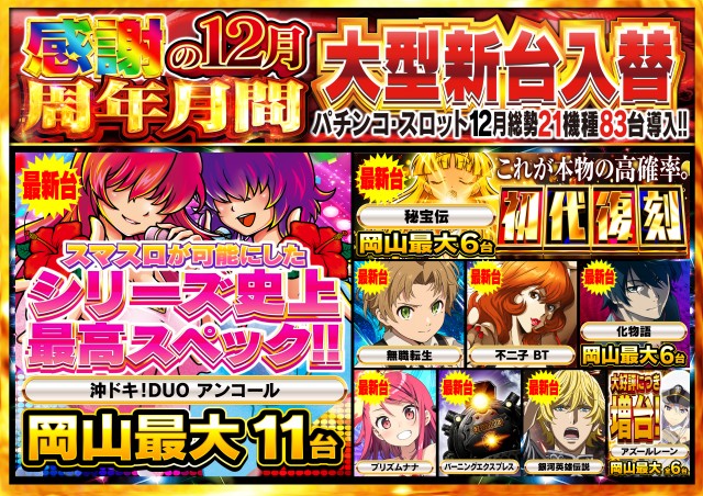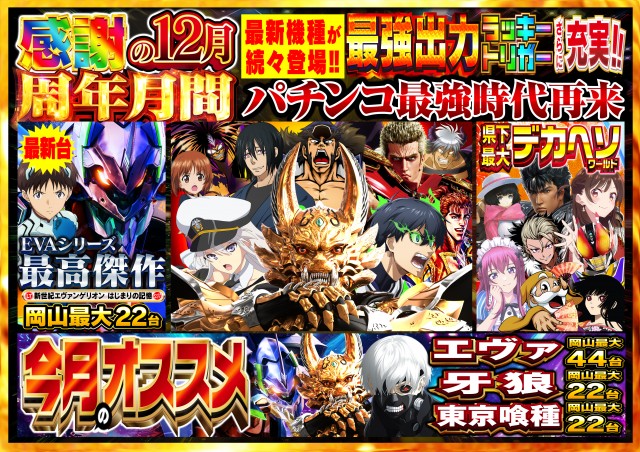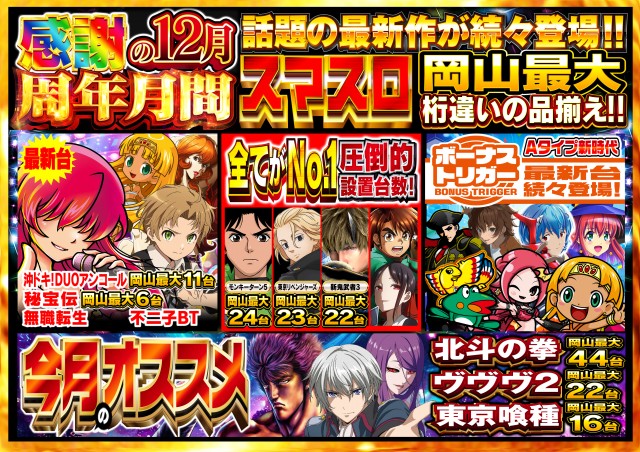 - ◆日本初防災特化型店舗 ◆岡山最大1144台 だから出来る 設置機種ラインナップ ◆広々とした楽々台間スペース ◆パチンコ・スロット 全台拡大計数機設置 ◆完全除菌・消臭ルーム ◆休憩ルーム コミック岡山最大数4000冊以上、 全席USBポート完備 ◆Wi₋fi完備 ◆VIP喫煙ルーム ◆マッサージコーナー ◆喫茶コーナー
