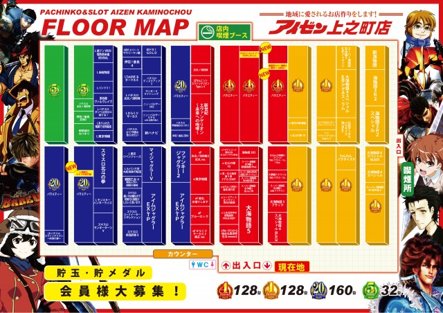 - 4円パチンコ:128台 178玉/200円:128台 46枚/1000円:160台 178枚/1000円:32台