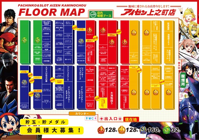 - 4円パチンコ:128台 178玉/200円:128台 46枚/1000円:160台 178枚/1000円:32台