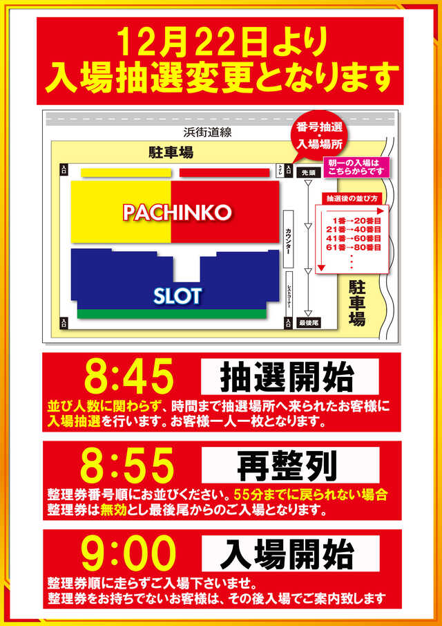 - 8時45分より、お並びのお客様を対象に入場順番を決める抽選を行います。
