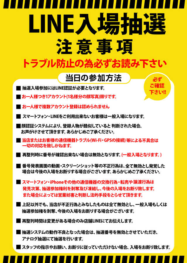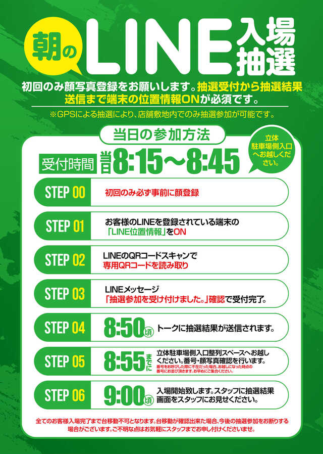 - 8時15分8時45分より店舗外立体駐車場下にてLINE抽選。※天候などにより変更の可能性あり