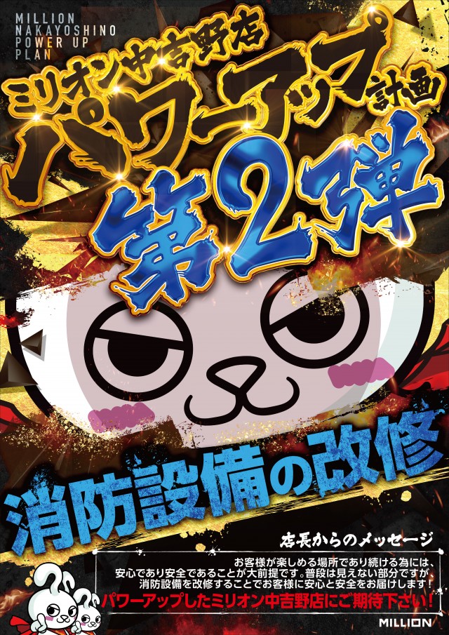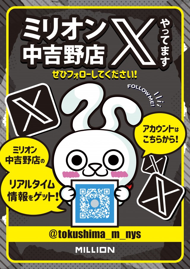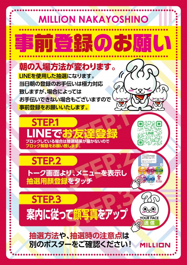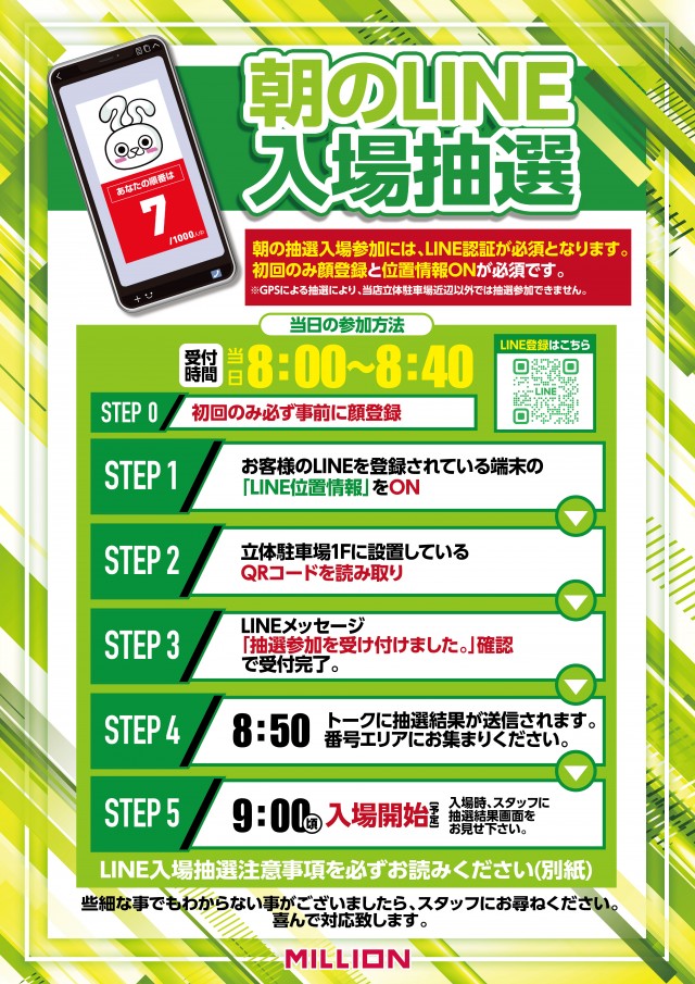 - LINE入場抽選を採用しております。8:00~8:40に立体駐車場1Fにて受付致します。まずは、ミリオン中吉野店のLINEおともだち登録をして、LINEメニューから顔写真登録をお願いします。ご不明点はお気軽にスタッフまでお問い合わせください。