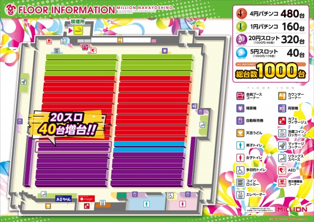 - [パチンコ] 4円:480台 1円:160台 計640台 [スロット] 1000円/46枚:320台 1000円/178枚:40台 計360台