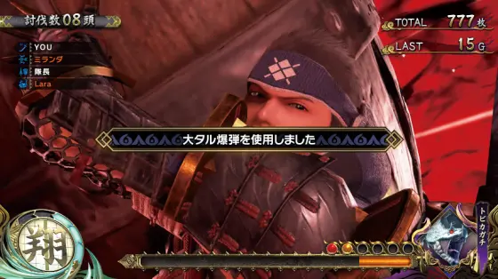 | モンスターが転倒し、一定ゲームの間毎ゲーム攻撃 | モンスターが眠り、次ゲームに大タル爆弾か溜め攻撃で大ダメージ。 レア役なら大タル爆弾Gか真溜め斬りで超大ダメージ |