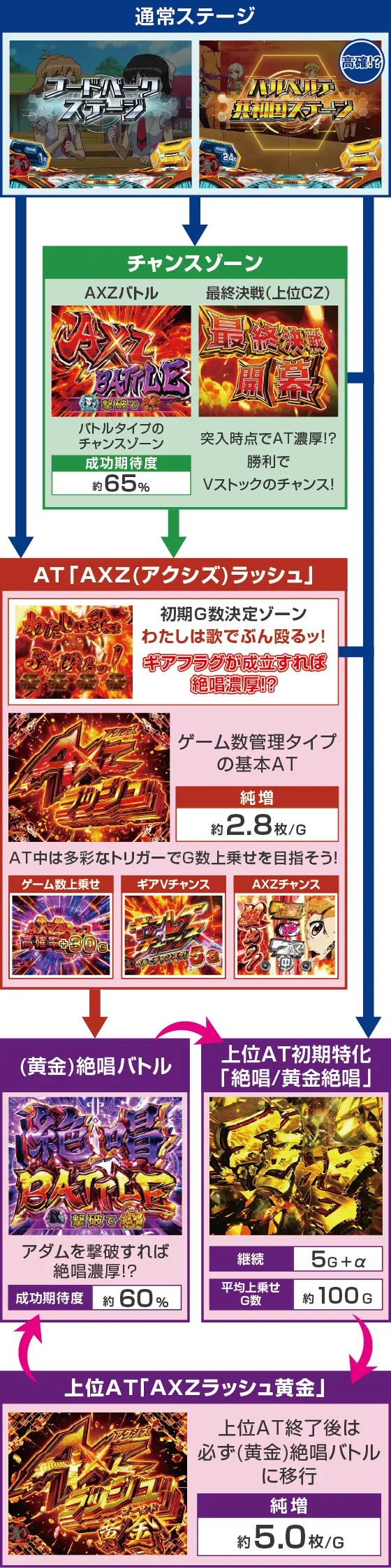 | ・上位AT終了後は必ず(黄金)絶唱バトルに移行 └バトルに負けない限り上位ATがループ!? |