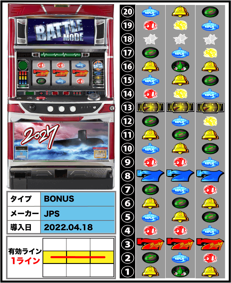 通常時は右リールが3択の「ソナー揃い」で、ボーナス高確率状態の「バトルモード」へと移行する。