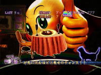 業深き刻終了画面でラッキーパトを押すと、登場人物のボイスが発生し、各ボイスの種類が設定を示唆している。